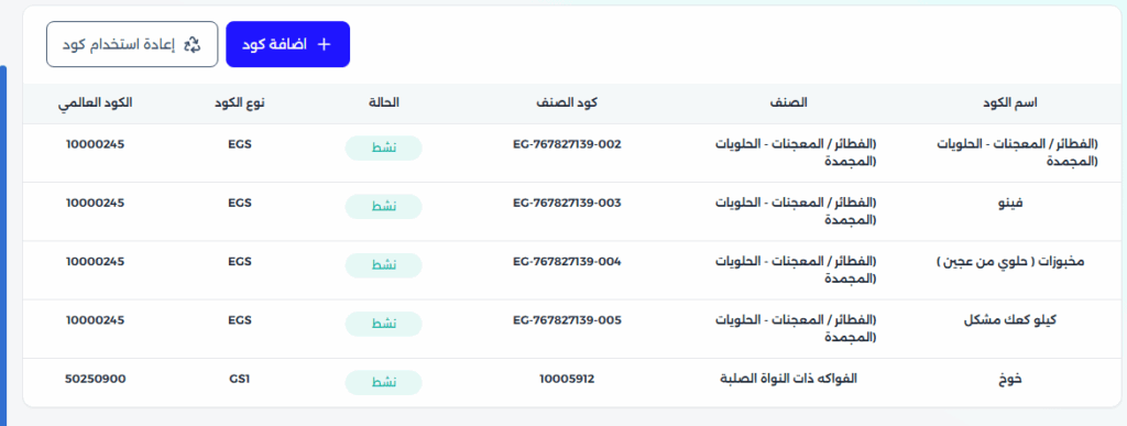 4- بعد التأكد من كود منتجك اضغط على زر تسجيل الكود حتى يتم حفظه وتسجيله لدى الدولة ، ولكي تستخدمه في إنشاء إيصالاتك أو فواتيرك الإلكترونية.