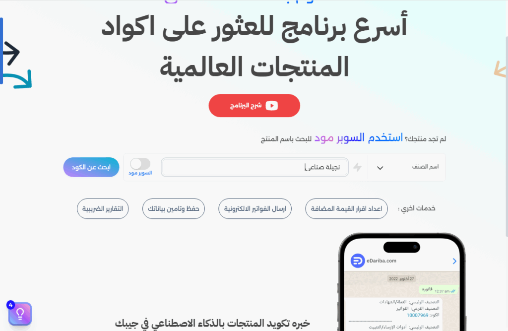 حولت eDariba عملية البحث المعقدة لأكواد المنتجات إلى عملية بسيطة وسريعة عن طريق إنشاء أداة بحث سريعة، و مدعومة بالذكاء الاصطناعي تعمل على فهم وصف، وأسماء منتجاتك مهما كان الاسم المعروف بها.