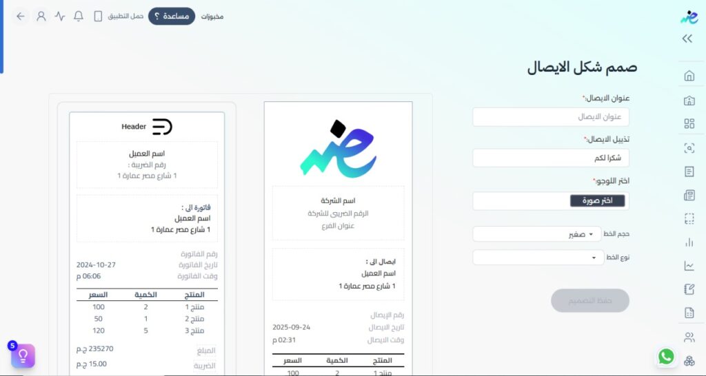 - الإيصال يحتوي بيانات السلعة/الخدمة، السعر، قيمة الضريبة، وكود التحقق (QR Code).
