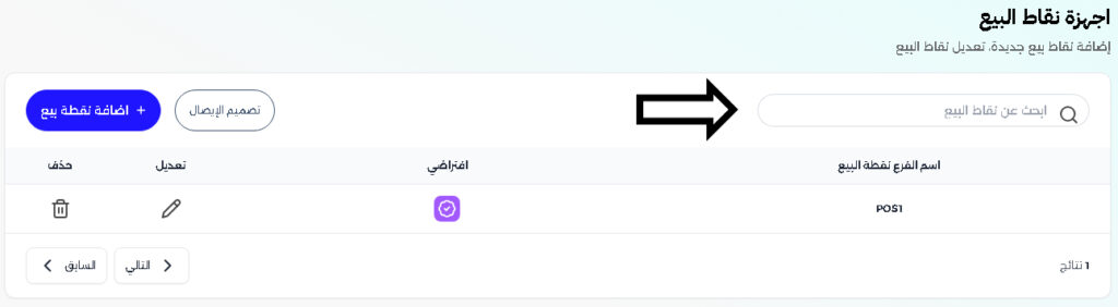 أعلى جدول عرض نقاط البيع ، إلى اليمين، يوجد مربع بحث حيث يمكنك إدخال كلمة، أو سلسلة من الكلمات، والنقر على زر “البحث في نقاط البيع” للبحث وعرض جميع نقاط البيع التي تلبي كلمات البحث الخاصة بك.