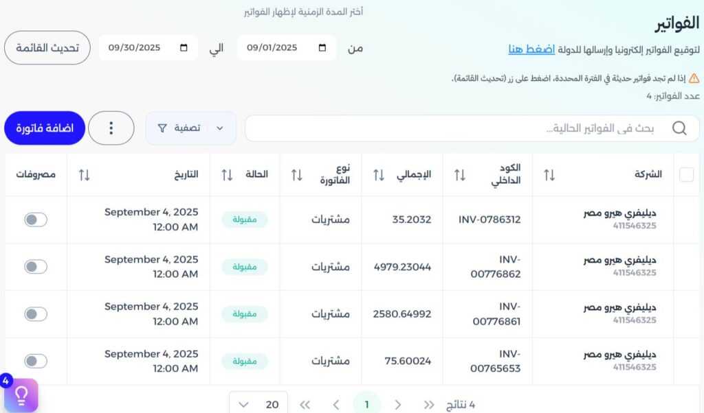 - عدد النتائج: يظهر أسفل الصفحة عدد الفواتير المعروضة (“4 نتائج” في هذه الصورة).