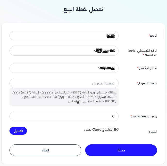 - العنوان – يظهر افتراضياً “EG,Cairo,Cairo” مع زر “تعديل” بجواره للسماح بتخصيص العنوان حسب الموقع الفعلي للفرع.